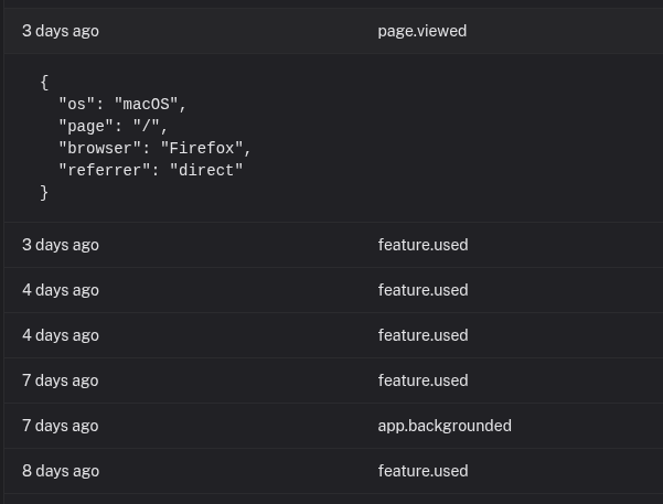 Attach any JSON data to your events. Track user details, metadata, custom properties. Click any event to see the full context.