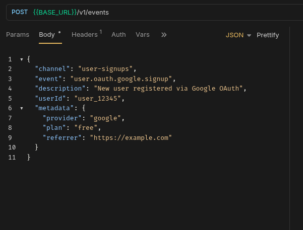 POST your event with a channel name, event name, and any metadata you want to attach. Events appear in your dashboard within seconds.