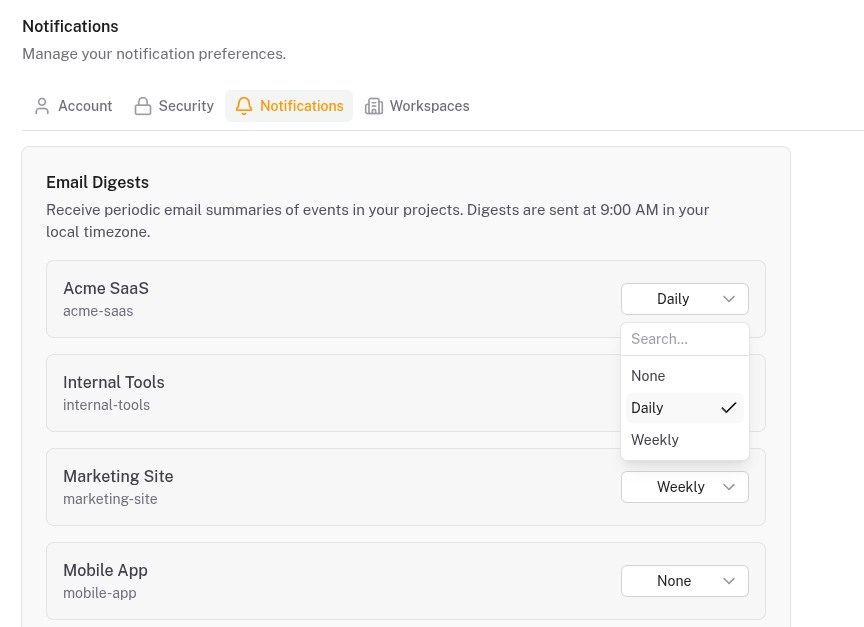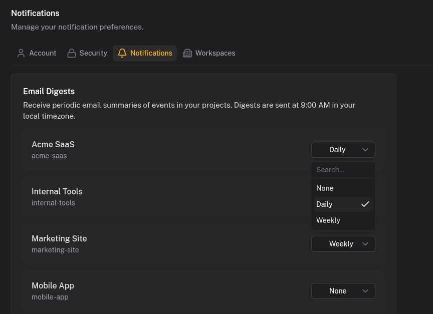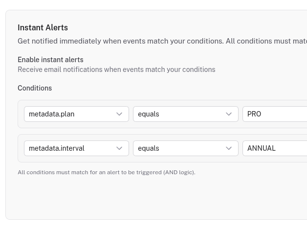 When an event is ingested, Quicklog saves it to your timeline and optionally sends a notification. Each channel has independent settings: instant push for signups, daily email digest for payments, nothing for deployments. Configure once.